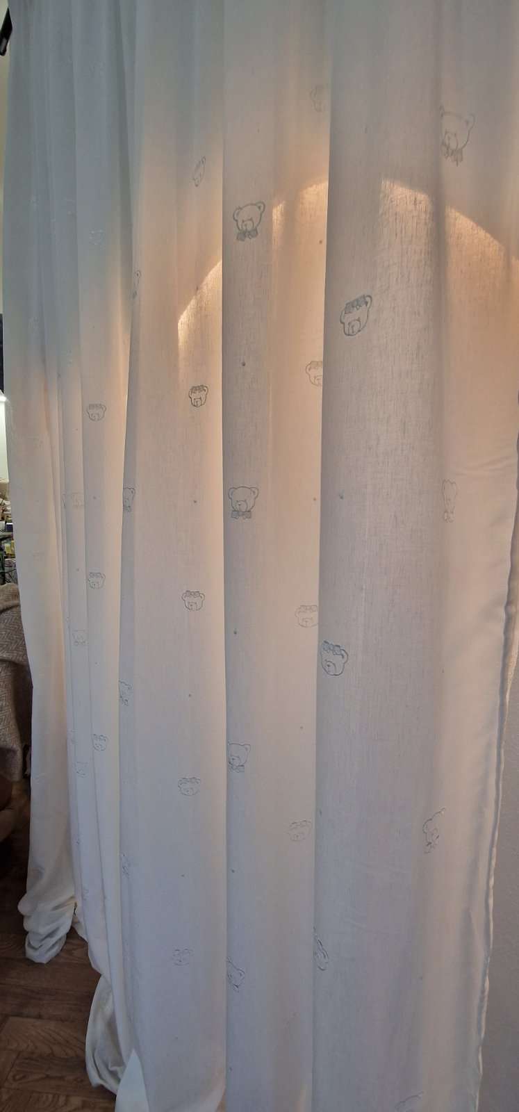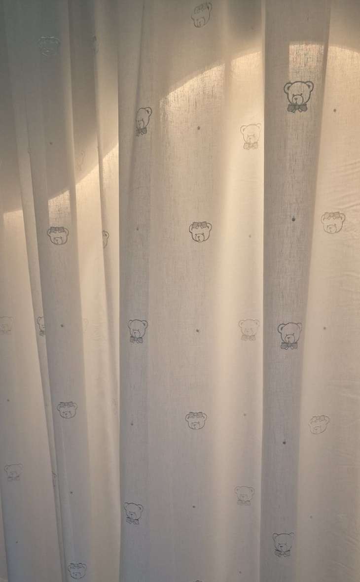 Κουρτίνα εκρού Γάζα με γκρι ανάγλυφα βαμβακερά teddy bear. Έτοιμη ραμμένη με τρέσα και γαντζάκια για να την κρεμάσετε σε σιδηρόδρομο ή κουρτινόξυλο.