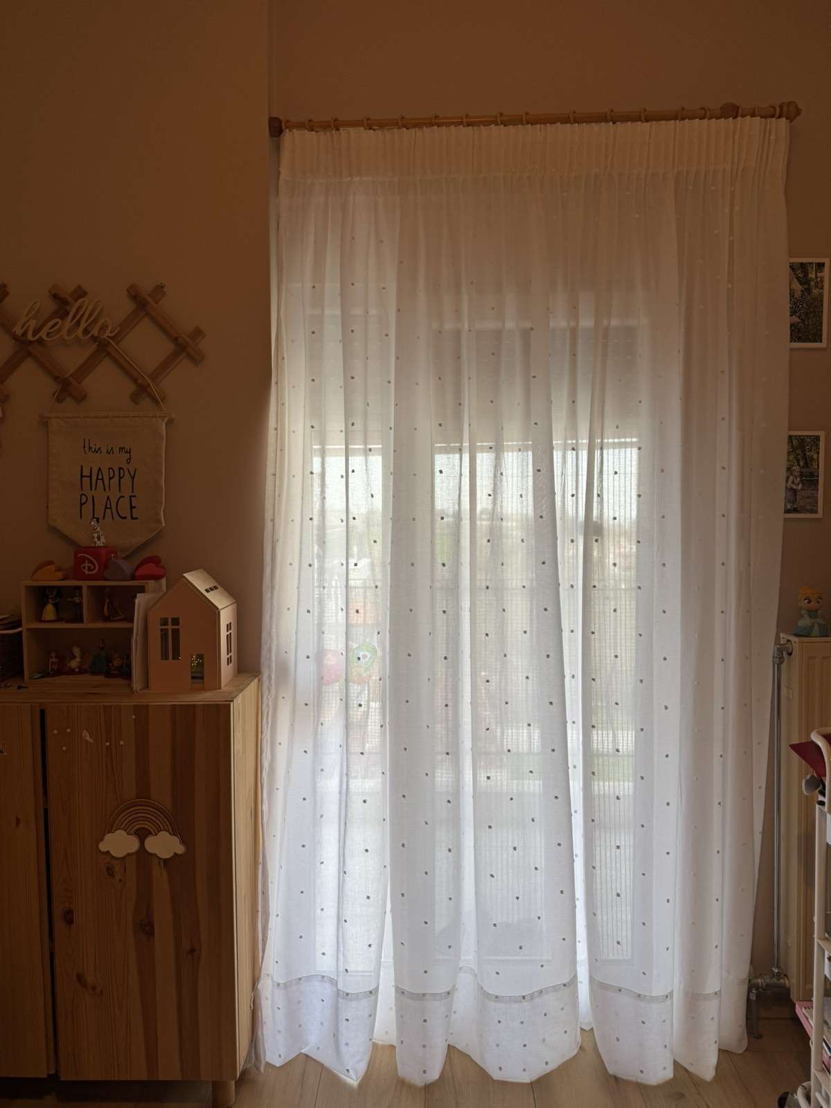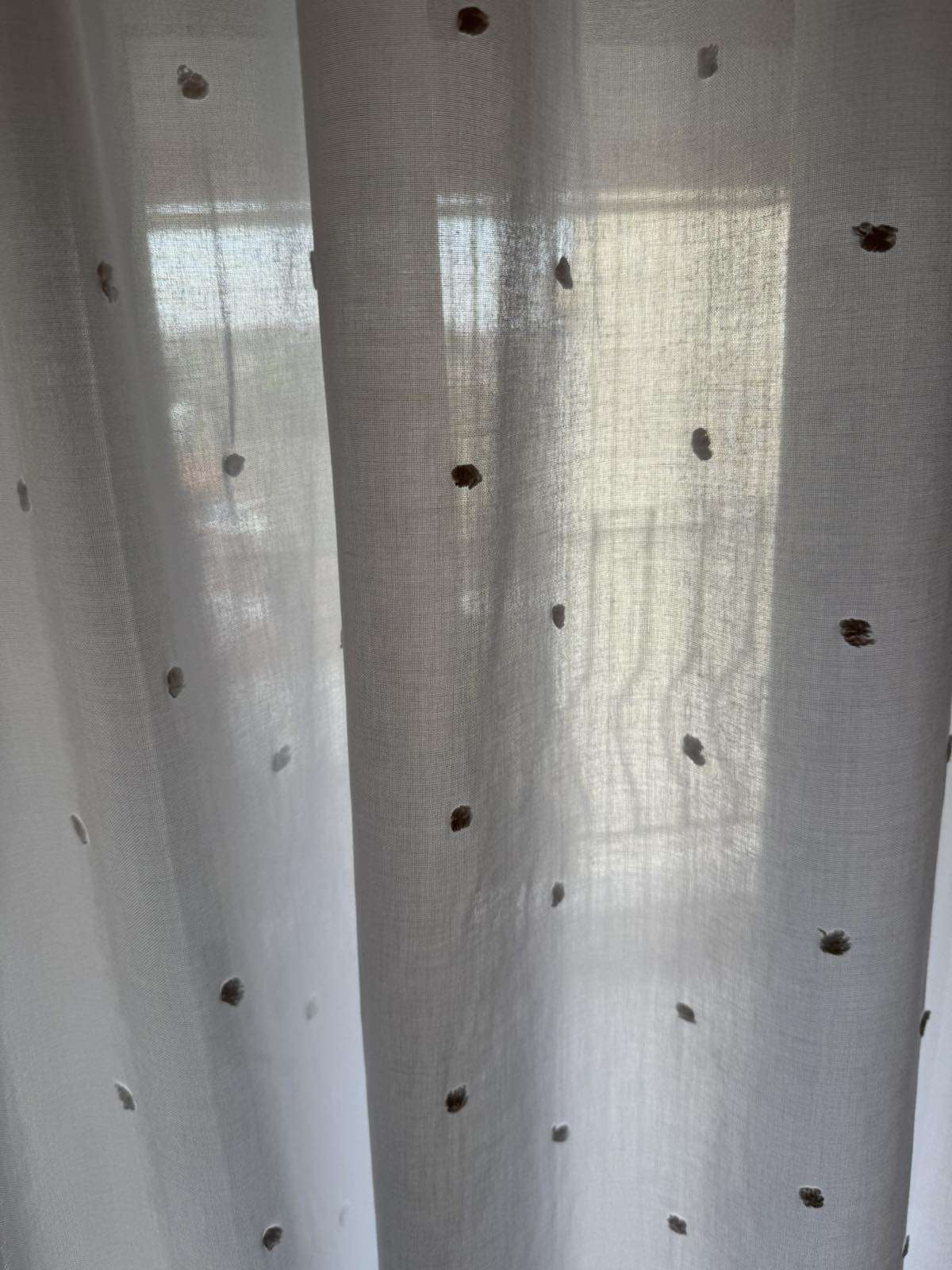Κουρτίνα Λευκή Γάζα με λευκά ανάγλυφα βαμβακερά dots. Έτοιμη ραμμένη με τρέσα και γαντζάκια για να την κρεμάσετε σε σιδηρόδρομο ή κουρτινόξυλο.