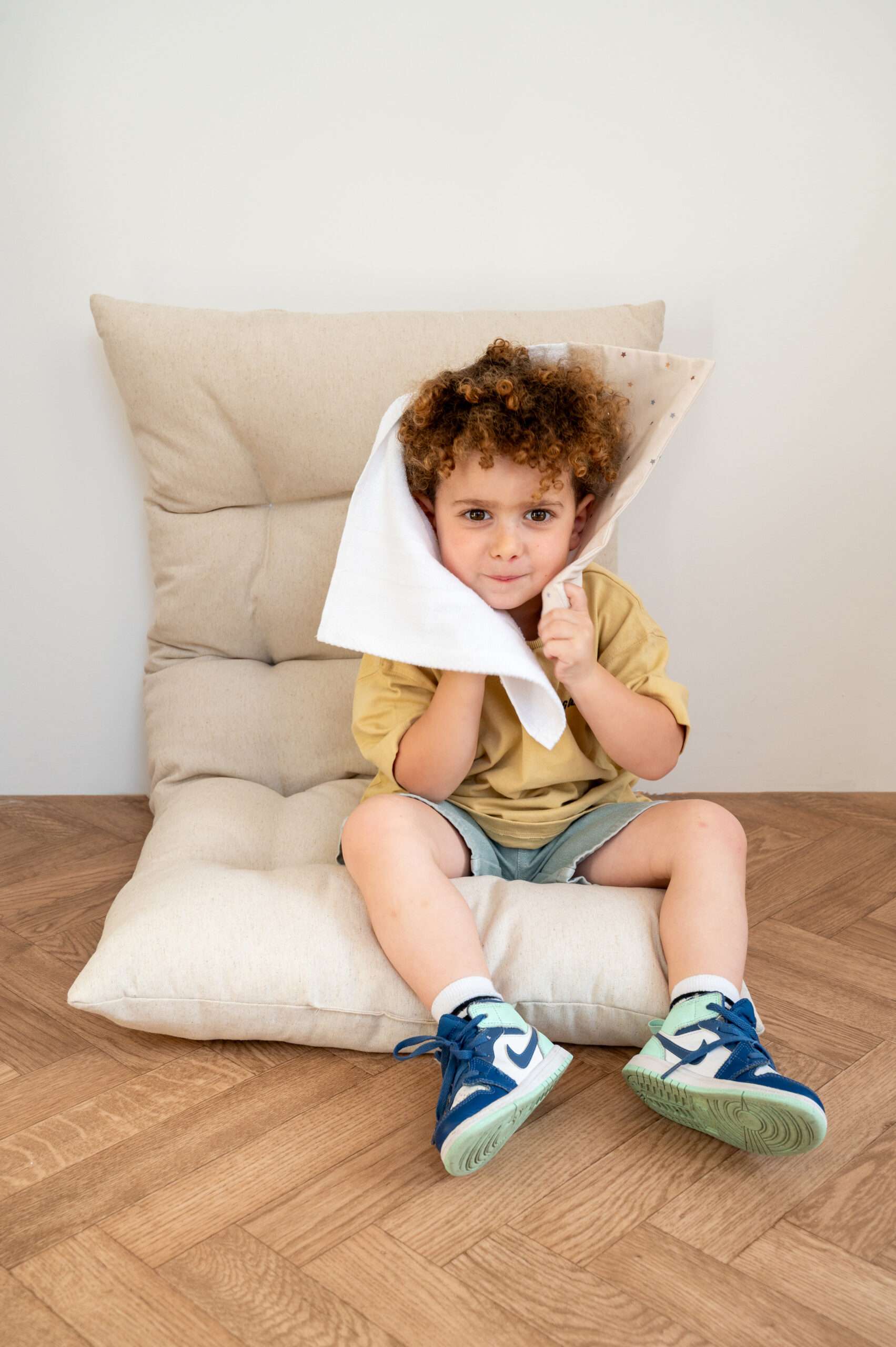 Χειροποίητη μαξιλάρα δαπέδου πολλαπλών χρήσεων ιδανική για το παιδικό το βρεφικό δωμάτιο αλλά γιατί όχι και το καθιστικό . Το εξωτερικό ύφασμά της είναι από βαμβάκι 100% στην μία όψη και μονόχρωμο ανθεκτικό βελούδο στην πίσω όψη. Το εσωτερικό γέμισμα είναι πολυεστερική βάτα και τρίμα .Μπορεί να χρησιμοποιηθεί σαν μαξιλάρα δαπέδου αλλά και σαν μαξιλάρα σε παγκάκι ή σε ξύλινο κουνιστό παιχνίδι (rocker).